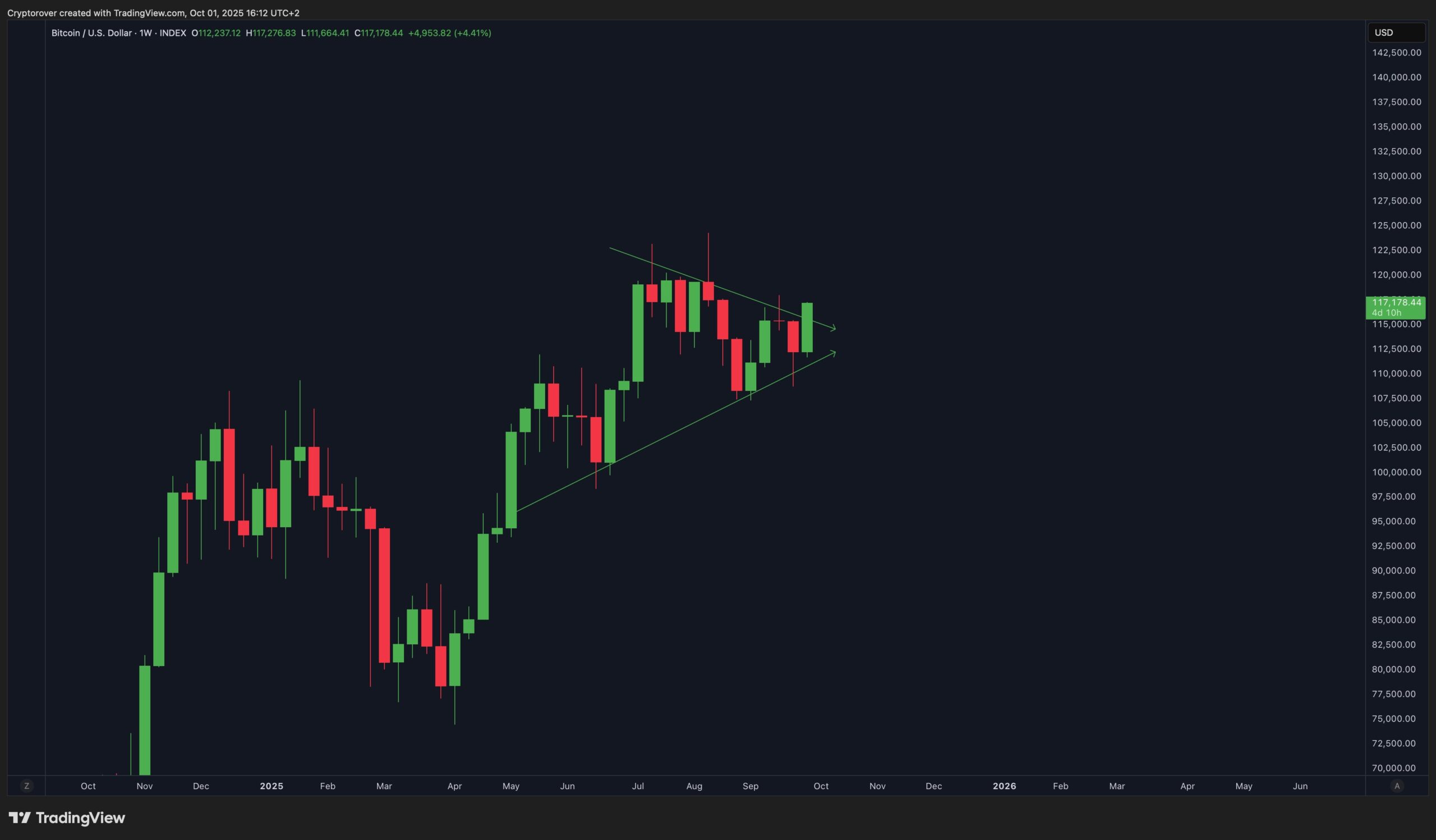 Auch die wöchentlichen Chartstrukturen erscheinen bullisch. Rover merkte an, dass die aktuelle Kerzenformation von Bitcoin einen möglichen Ausbruch signalisiert, wobei sich die Konsolidierung zu einem Keilmuster verdichtet.
