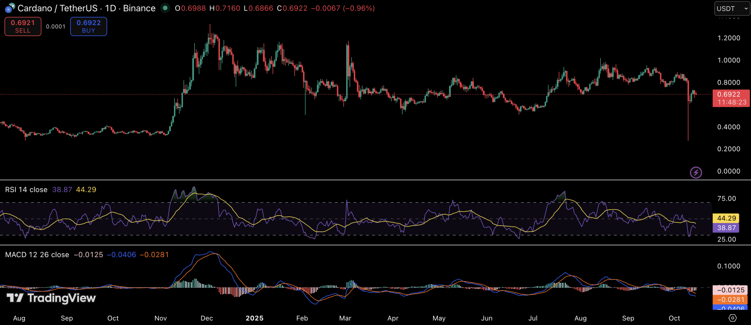 Cardano (ADA) wird nach einer turbulenten Woche, die von massiven Verkäufen durch Großinvestoren geprägt war und den Kurs unter 0,5 US-Dollar drückte, derzeit bei knapp 0,70 US-Dollar gehandelt.