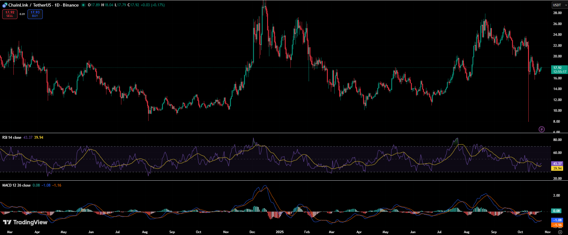 Chainlink (LINK) zeigt weiterhin Widerstandsfähigkeit nahe der 17,6-Dollar-Marke, unterstützt durch eine wachsende On-Chain-Akkumulation und expandierende institutionelle Partnerschaften. Nach der Erholung von seiner jüngsten Nachfragzone spiegeln die technischen Indikatoren von LINK nun eine sich verfestigende Marktstruktur wider, die einem bedeutenden Ausbruch vorausgehen könnte. Analysten gehen davon aus, dass ein anhaltender Anstieg über 25 Dollar eine starke Rallye auslösen könnte, die den Vermögenswert langfristig auf 100 Dollar treiben könnte.