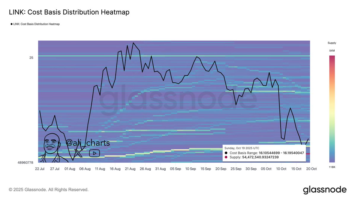 Laut den von Analyst Ali veröffentlichten On-Chain-Daten wurden rund 54,47 Millionen LINK-Token zwischen 16,10 und 16,19 US-Dollar erworben. Diese Preisspanne ist zu einem kritischen Kostenbasis-Cluster geworden, was auf eine starke Überzeugung der Anleger hindeutet und eine potenzielle Startrampe für die nächste Aufwärtsbewegung bildet.