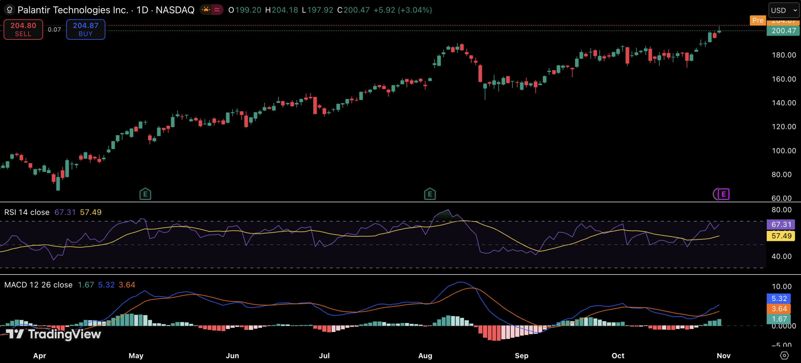 Aus technischer Sicht hat Palantir ein überbewertetes Terrain betreten, zeigt aber weiterhin Widerstandsfähigkeit. Der RSI der Aktie liegt bei 67, was auf eine starke Dynamik hindeutet, aber auch auf eine mögliche Abkühlungsphase, falls die Ergebnisse enttäuschen sollten. Der MACD-Indikator bleibt unterdessen eindeutig positiv und bestätigt die bullische Dynamik.