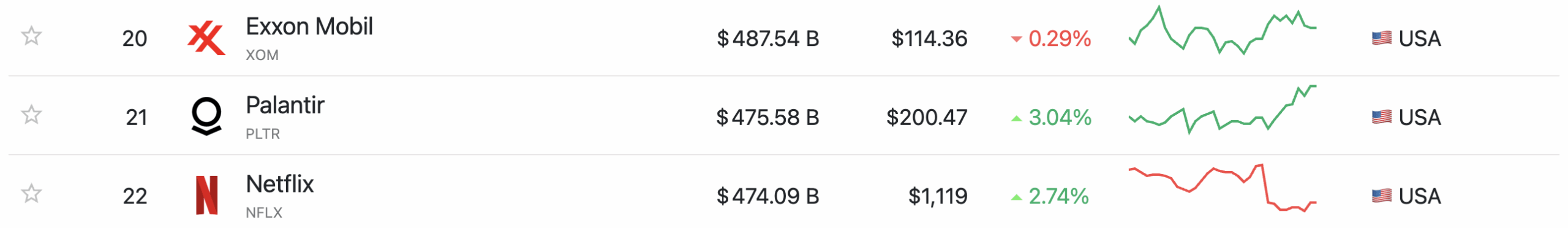 Bei Börsenschluss am Freitag notierte die Palantir-Aktie bei 200,47 USD, was einem Tagesplus von 3,04 % entspricht, wobei die Vorbörsenkurse bereits in Richtung 205 USD tendierten. Mit einer Marktkapitalisierung von 475,5 Milliarden US-Dollar rangiert Palantir nun auf Platz 21 der weltweit größten Unternehmen und liegt damit zwischen Exxon Mobil und Netflix – ein symbolischer Meilenstein, der unterstreicht, wie wichtig das Unternehmen im Wettlauf um die kommerzielle Nutzung künstlicher Intelligenz in großem Maßstab geworden ist.