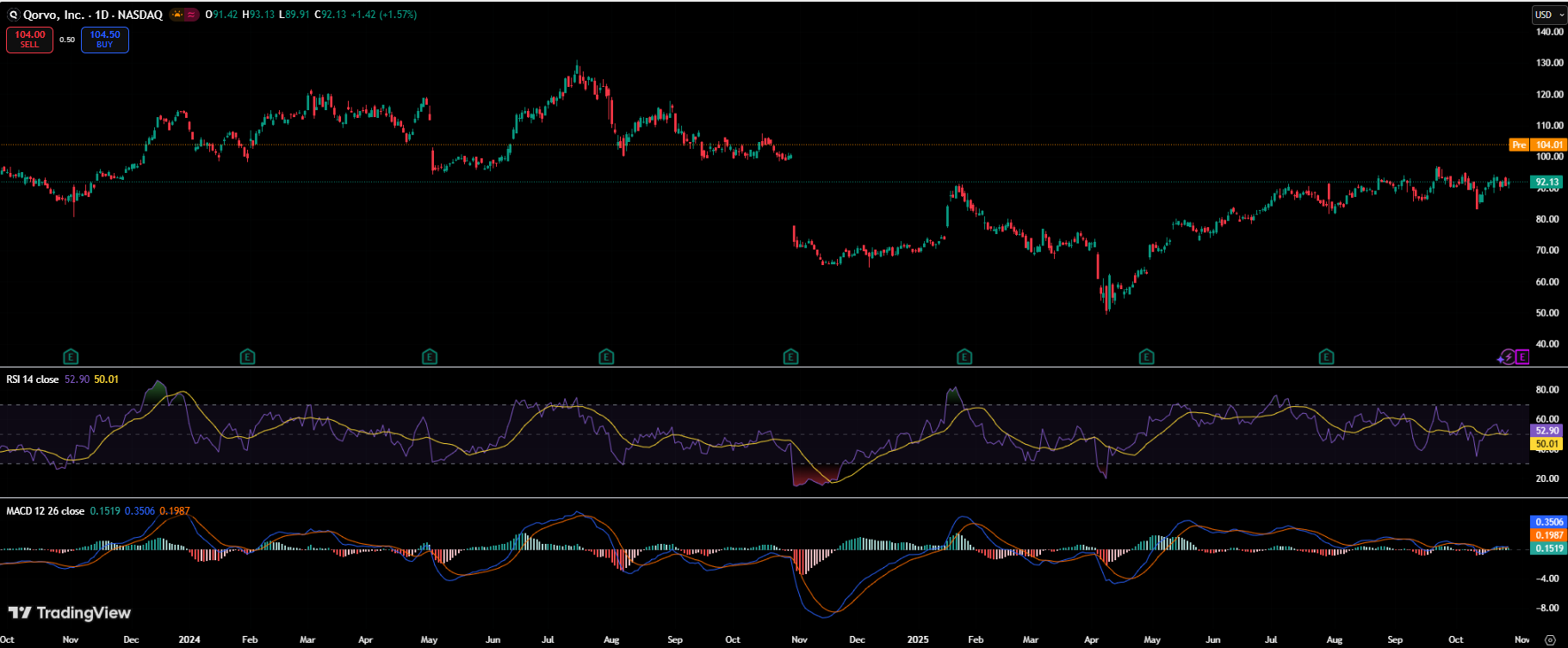 Technisch gesehen zeigt die Aktie von Qorvo nach der Erholung von den Tiefstständen Anfang 2025 eine zunehmende Stärke. Momentum-Indikatoren wie der MACD haben sich positiv entwickelt, während der RSI bei 53 auf weiteres Aufwärtspotenzial hindeutet, ohne dass eine Überkaufsituation signalisiert wird. Der nächste wichtige Widerstandsbereich liegt bei 104 USD, wobei eine anhaltende Bewegung über diesem Niveau möglicherweise eine Fortsetzung des Ausbruchs auslösen könnte.