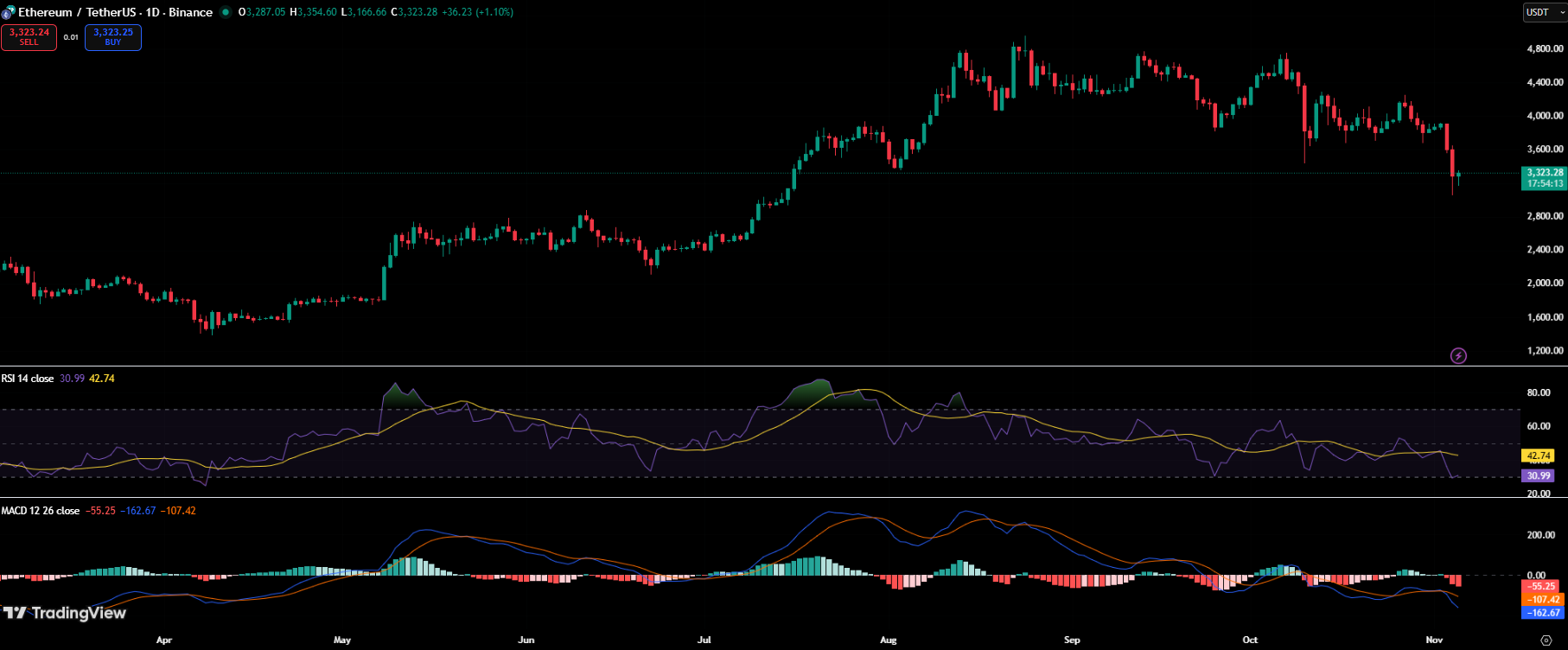 Zum Zeitpunkt der Erstellung dieses Artikels wird Ethereum bei 3.321 USD gehandelt, was einem Tagesrückgang von 5 % und einem steilen Verlust von 17,6 % für die Woche entspricht. Die Marktkapitalisierung des Tokens ist auf 400,8 Milliarden US-Dollar gefallen, während das 24-Stunden-Handelsvolumen bei 80,7 Milliarden US-Dollar liegt, was auf eine hohe Volatilität und rege Börsenaktivität hindeutet.