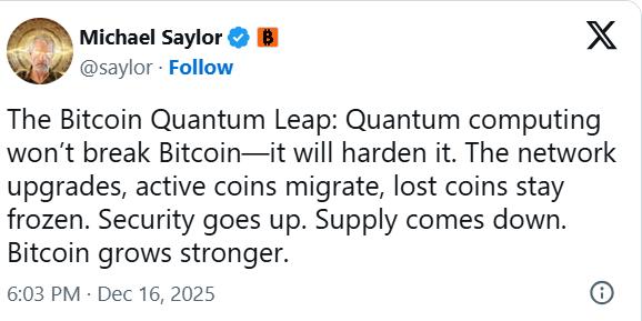 Michael Saylor pushed back against quantum concerns, arguing that the technology will actually strengthen Bitcoin rather than weaken it. He suggested that quantum computing advances will drive better security implementations across the network.
