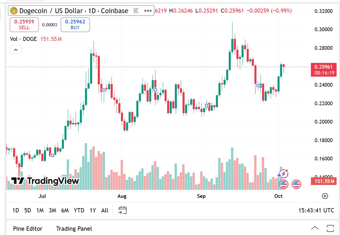Right now, Dogecoin is sitting at about $0.2595, which is a small dip, around 0.63% down over the past day. The bigger picture is its size: the coin still carries a market value of roughly $38.66 billion.