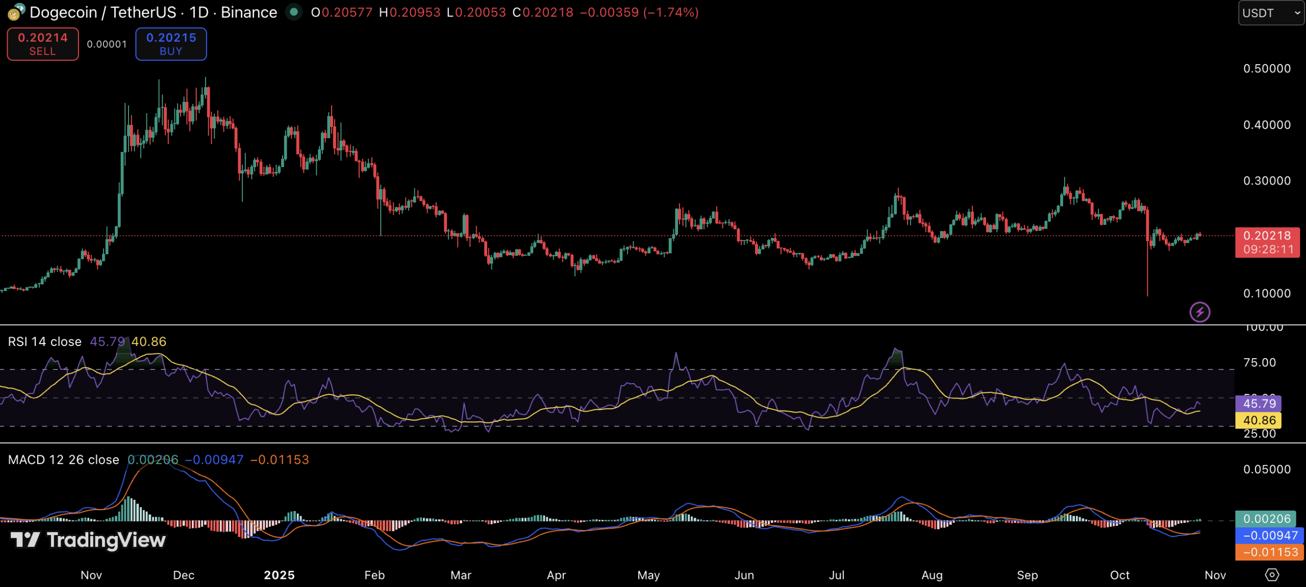 DOGE currently trades near $0.20, where the 14-day Relative Strength Index (RSI) has recovered to around 46, suggesting neutral momentum after a recent pullback. The Moving Average Convergence Divergence (MACD) indicator, meanwhile, hints at an early-stage bullish crossover, which could mark the beginning of a broader recovery phase if confirmed by volume.