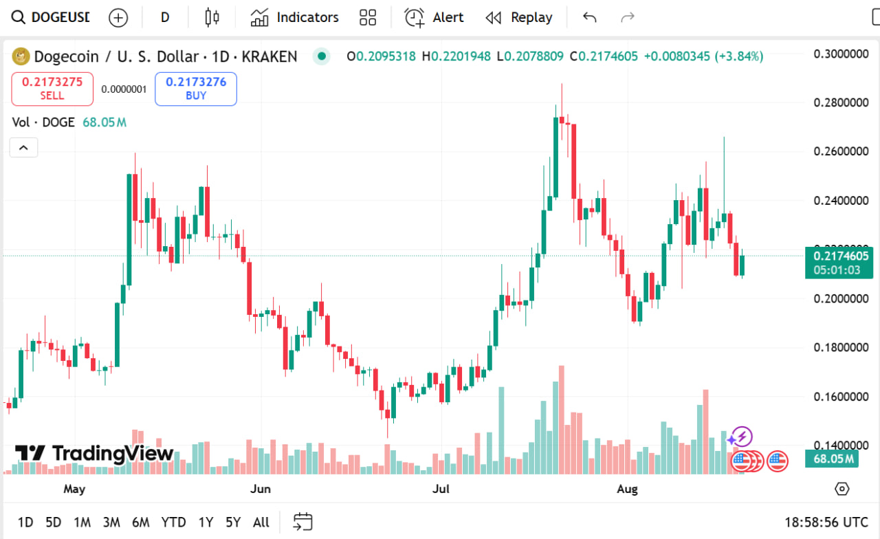 The crypto market is showing signs of renewed strength. Dogecoin trades at $0.2193, a 2.66% boost, and boasts a market cap of $33.02 billion with more than $3.36 billion in trading volume per day.