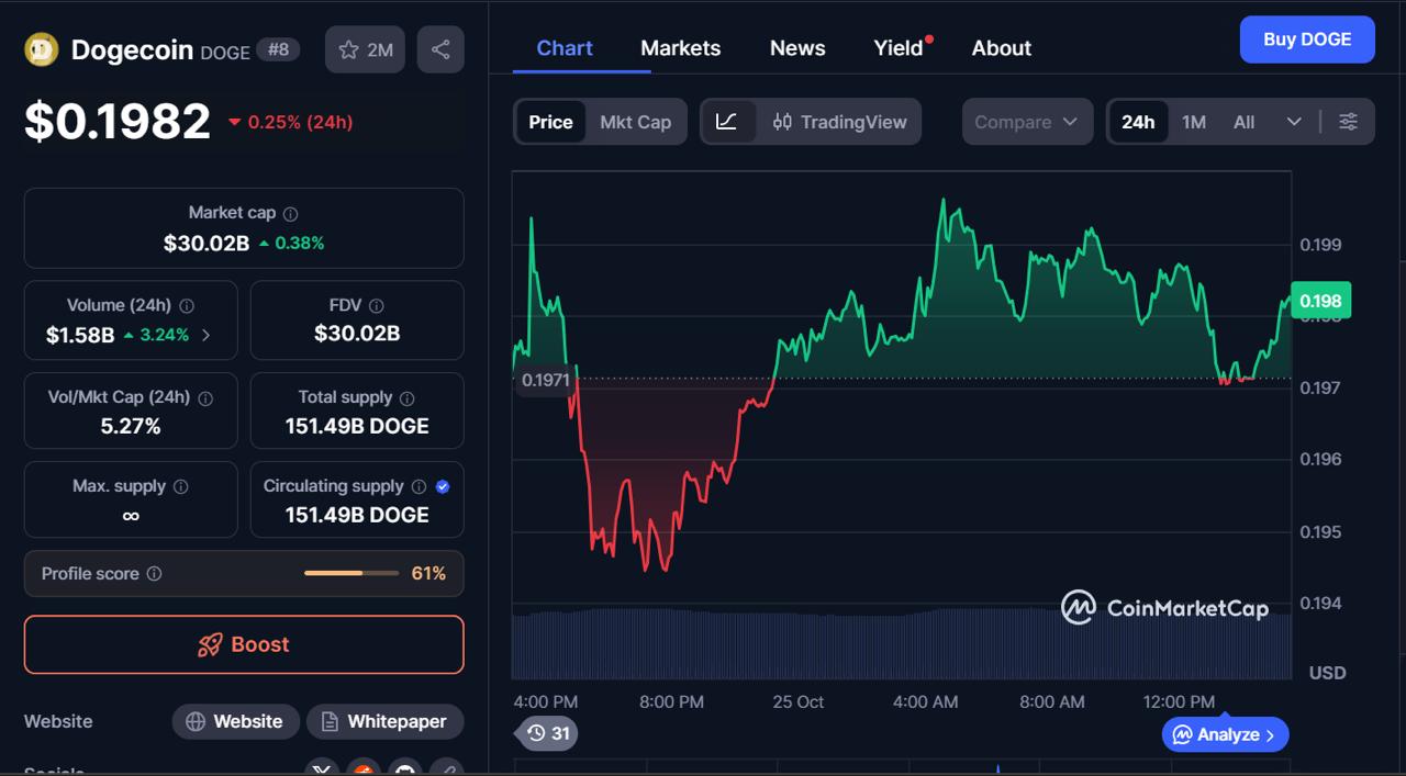 DOGE has reached a key decision point after trading below a strong descending trendline for days. The price is now testing resistance near $0.20. Buyers are trying to push higher after forming a steady series of higher lows. Sellers are still defending the trendline that has capped gains since the last major drop from $0.25.