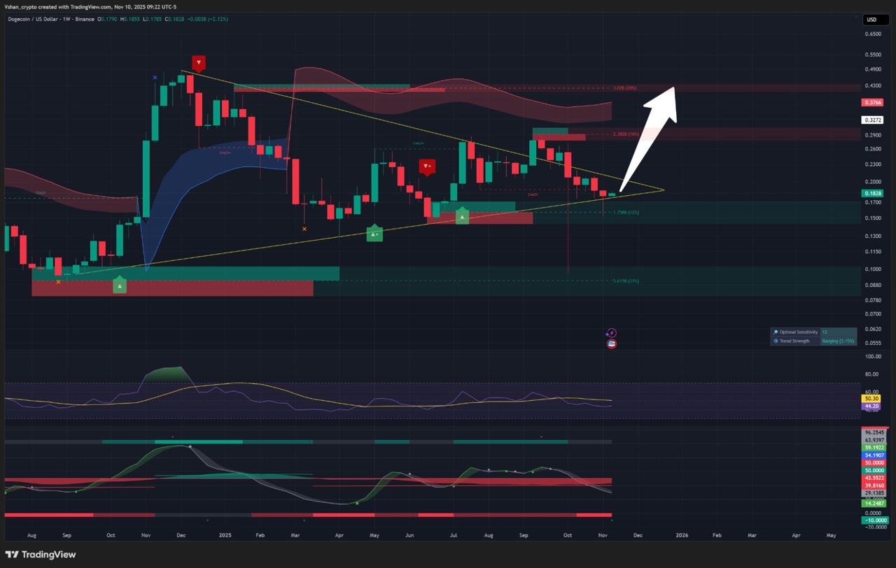 Trading near $0.18, DOGE has bounced from $0.161 and is back in bullish territory. Chartist Shan Specter calls the re-entry a strong signal, pointing to potential targets at $0.40, $0.70, and even $1.00 if momentum picks up.