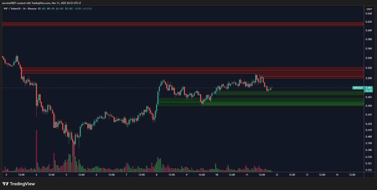 Analyst CW highlights $0.52 as a key level. Sell orders have kept WIF capped there for weeks, but the token keeps forming higher lows. That suggests quiet buying. Still, without a breakout, WIF could dip toward $0.45–$0.47 before trying again.