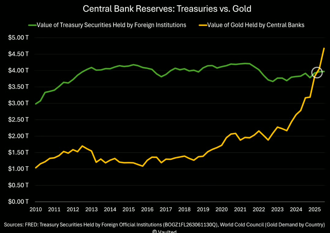 For the first time since 1996, the total value of gold held by central banks – estimated at roughly $4.6 trillion – has surpassed the value of the U.S. Treasuries they hold, which stands near $3.9 trillion. This reversal highlights a growing preference for hard assets over sovereign debt among monetary authorities.