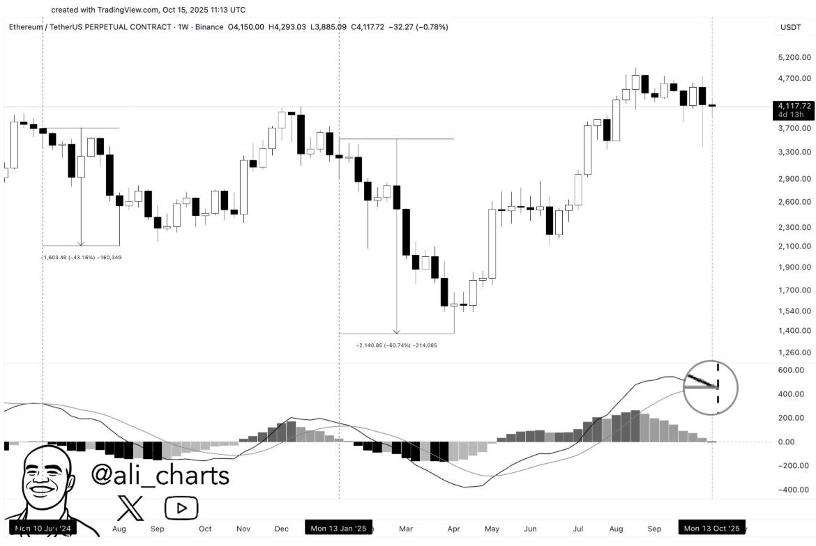 Although there are optimistic expectations about Ethereum, analyst Ali Martinez pointed out that the asset is about to enter a bearish MACD crossover on the weekly chart. In the past, similar signals preceded sharp corrections of 43% and 61%, implying caution in the weakening momentum.