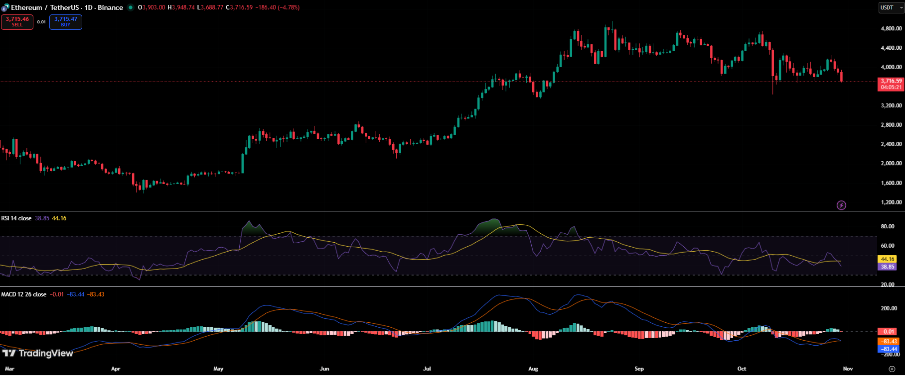From a technical perspective, Ethereum is facing clear headwinds. The daily chart shows ETH trading below its 50-day moving average, while the RSI at 44 reflects fading momentum. The MACD indicator also shows a mild bearish crossover, pointing to the potential for further downside if selling pressure continues.