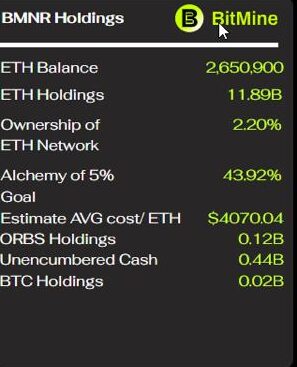 BitMine Immersion Technologies has rapidly expanded its Ethereum treasury, now holding over 2.65 million ETH valued at more than $11 billion. In just seven days, the company executed purchases worth approximately $961 million, cementing its place as the largest corporate ETH holder.
