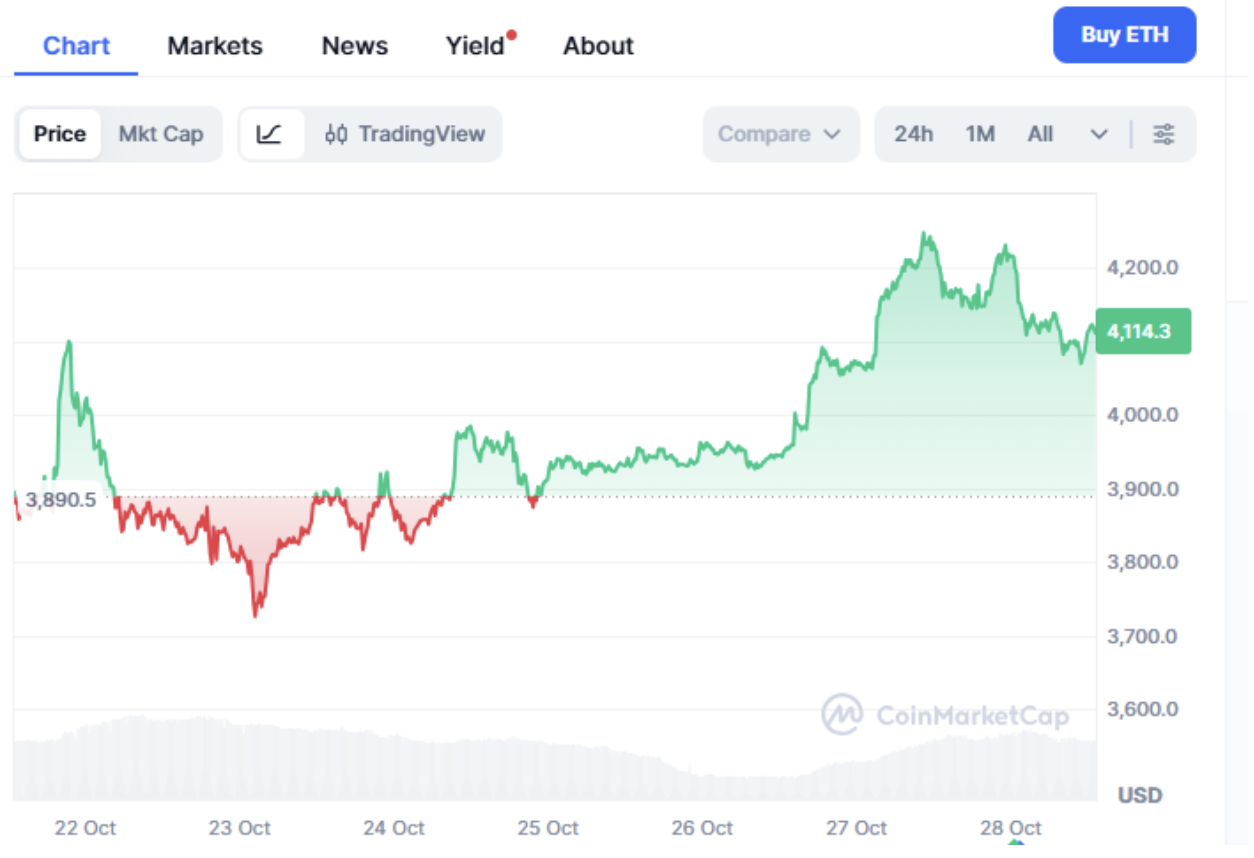 Ethereum (ETH) has shown strong momentum recently, trading at $4,116.16 and rising 5.98% over the past week, reflecting growing investor confidence. Factors driving growth include institutional adoption, Ethereum 2.0 upgrades, and expanding use of decentralized applications (dApps).