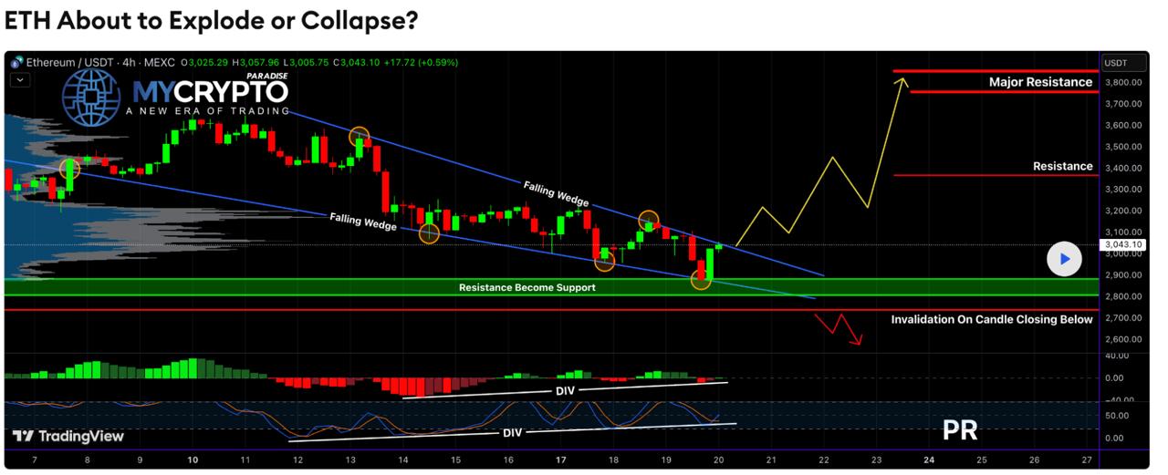 Momentum looks promising. RSI is back above 50. The MACD just flipped green. Price action is forming a falling wedge, a pattern that often leads to breakouts. A clean move above $3,100 would confirm it. A drop below $2,950 would weaken the outlook.