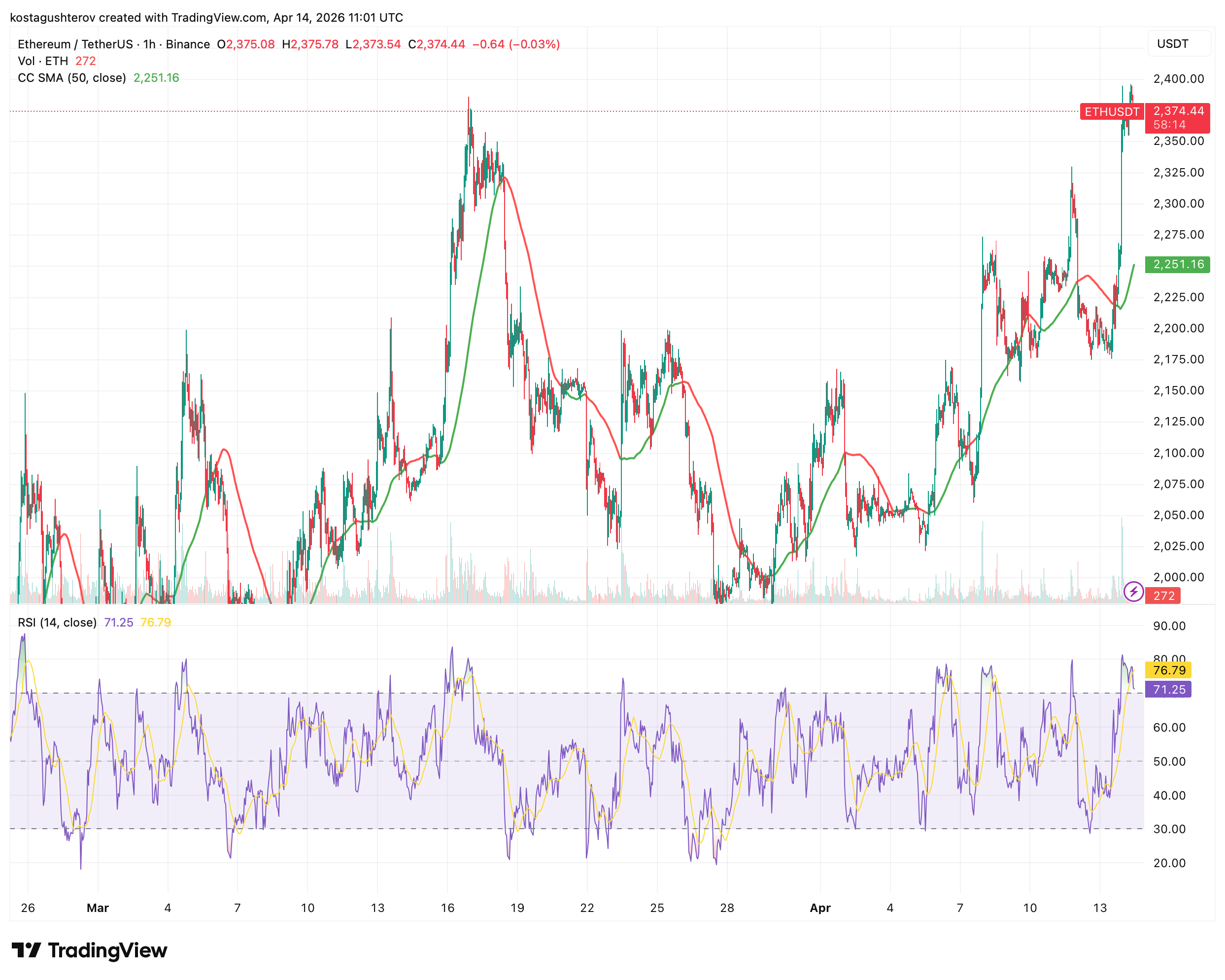 Ethereum is trading at $2,374 at the time of writing, up from a $2,000 floor that held twice in late March and early April, gaining 8.6% in the past 24 hours. The 50 SMA at $2,251 is rising and now $123 below price, the first clean above-SMA structure ETH has built since mid-March.