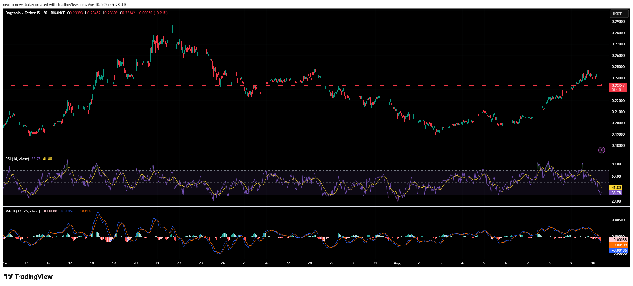 Technically, Dogecoin’s RSI is hovering in the low 30s, approaching oversold territory. Holding $0.23 could set up a short-term bounce, while failure to defend it may send the price toward $0.21.