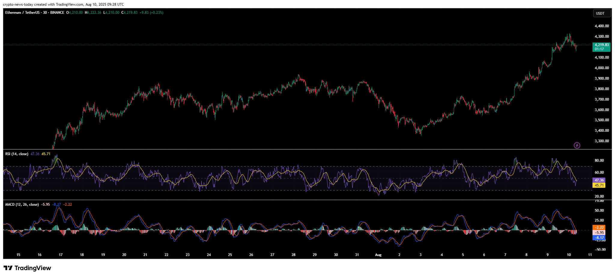 From a technical perspective, Ethereum’s RSI is near 47, indicating it’s not yet overbought. Support remains around $4,100, while $4,300 is the key resistance level that could trigger a fresh breakout.