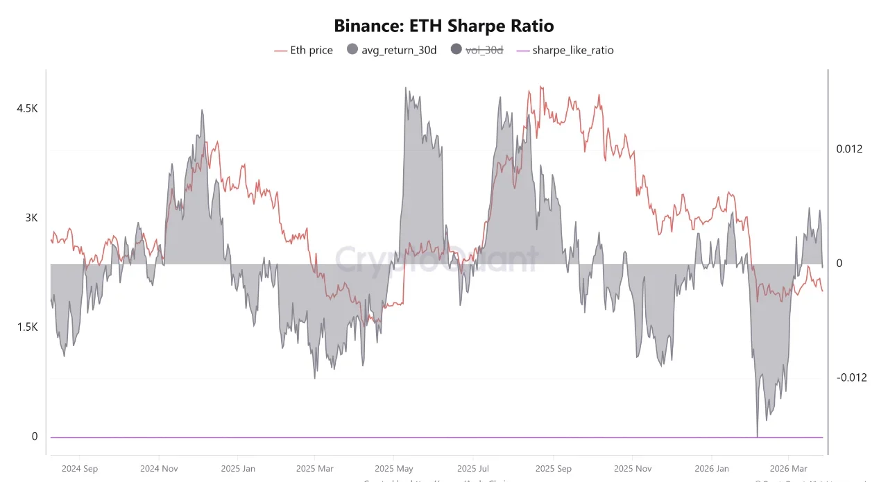 Zooming out to the on-chain analytics layer, CryptoQuant data tells a less flattering story about ETH as a risk-adjusted holding over the past month. The 30-day average return for Ethereum on Binance stands at −0.00039, and the resulting Sharpe-like ratio has dipped to approximately −0.0012.