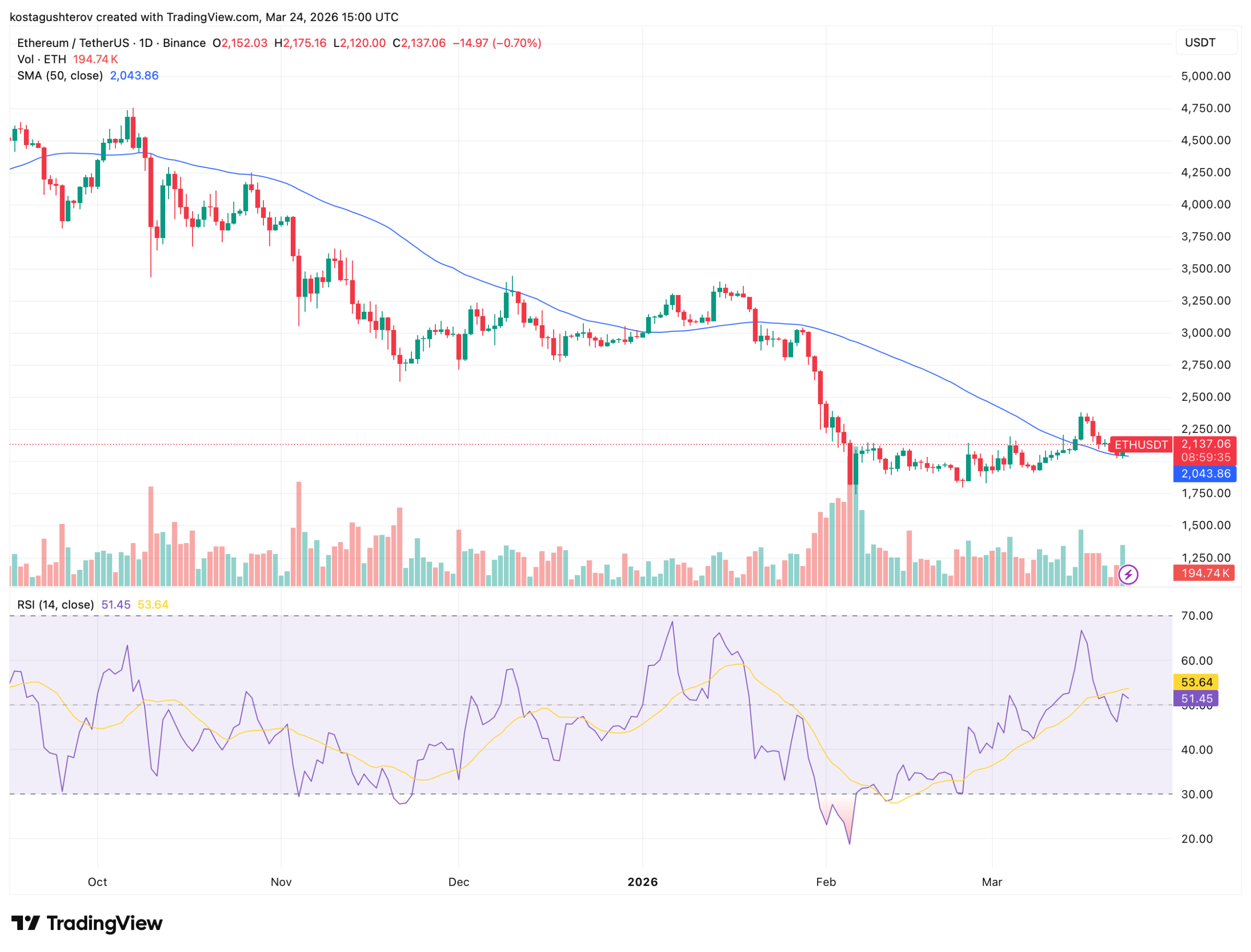 Price recovered from that level through late February and into March. The 50-day moving average, which had been pointing sharply downward for months, has recently begun to flatten at $2,043. ETH has crossed back above it. That flattening is the first structural change in the trend worth noting. It does not confirm a reversal. It suggests the selling pressure that drove the downtrend is at least losing intensity.
