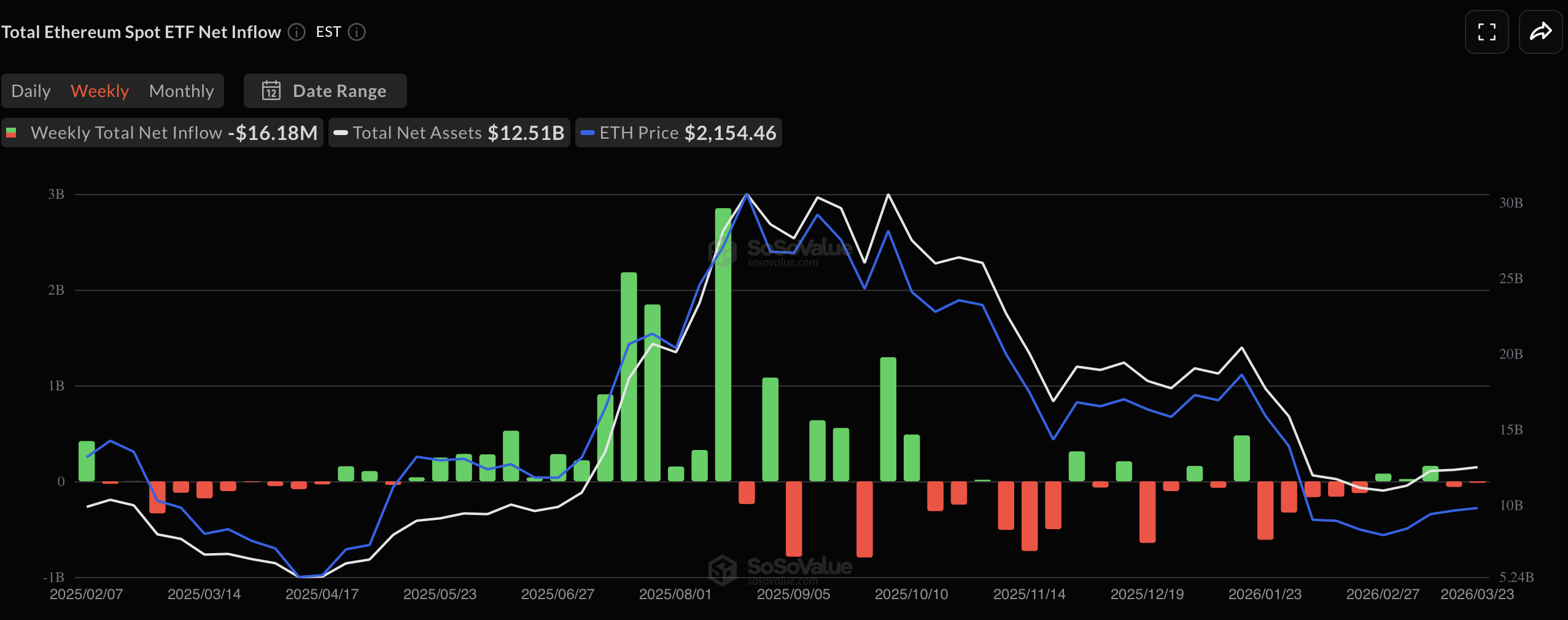 Zooming to the weekly view, total net flows across all spot Ethereum ETFs came in at minus $16.18 million for the week ending March 23. Total net assets across the category sit at $12.51 billion. The weekly bar chart tells the longer story more clearly. Since September 2025, the pattern has been predominantly outflows, with brief inflow weeks that established no sustained trend and quickly reversed.