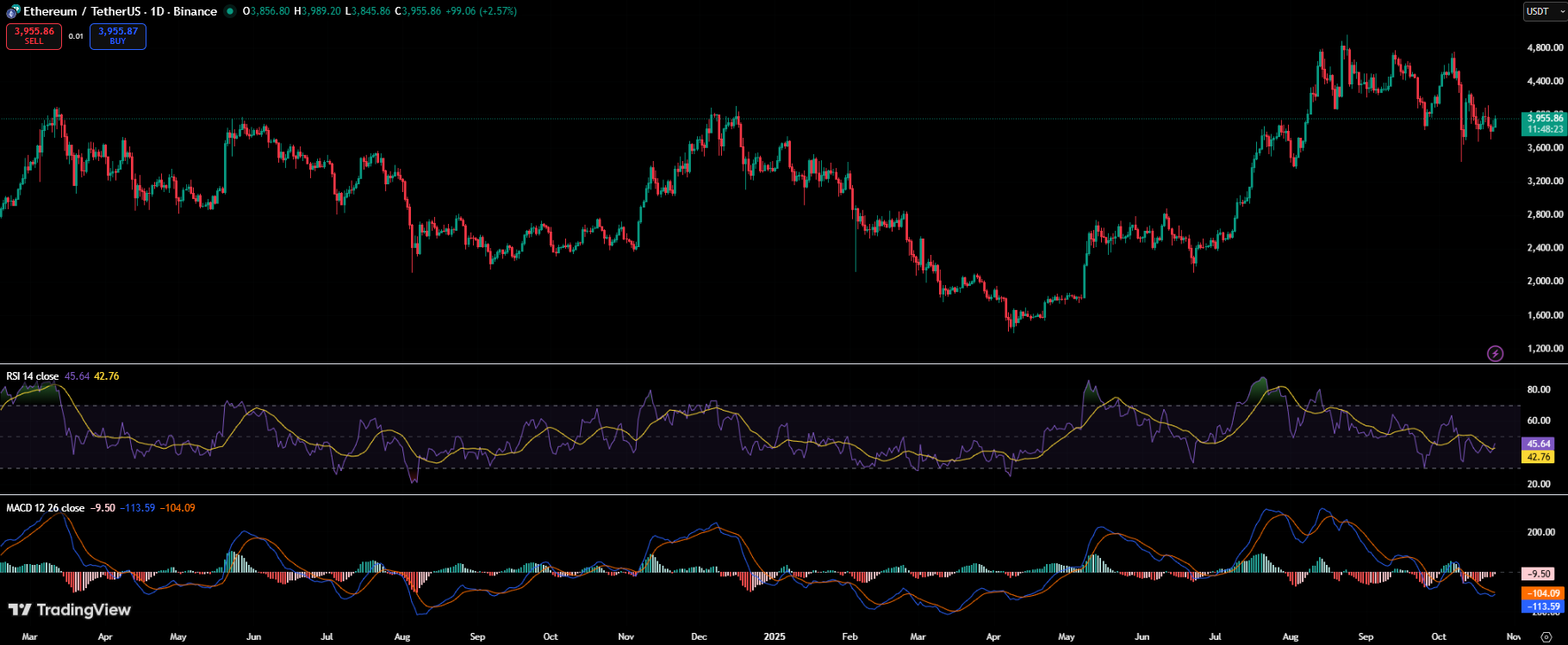 Sur le plan technique, le RSI quotidien d’Ethereum reste proche de 45, laissant de la marge à la hausse avant des zones de surachat. Parallèlement, le MACD montre des signes précoces d’un affaiblissement de l’élan baissier. Si l’ETH parvient à se maintenir au-dessus de 4.000 $, les traders s’attendent à une confirmation technique plus solide pour la prochaine jambe haussière.