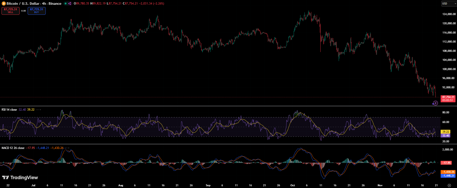 - Le Bitcoin est tombé sous 88.000 $ alors que la pression vendeuse s’est intensifiée sur les plateformes d’échange.