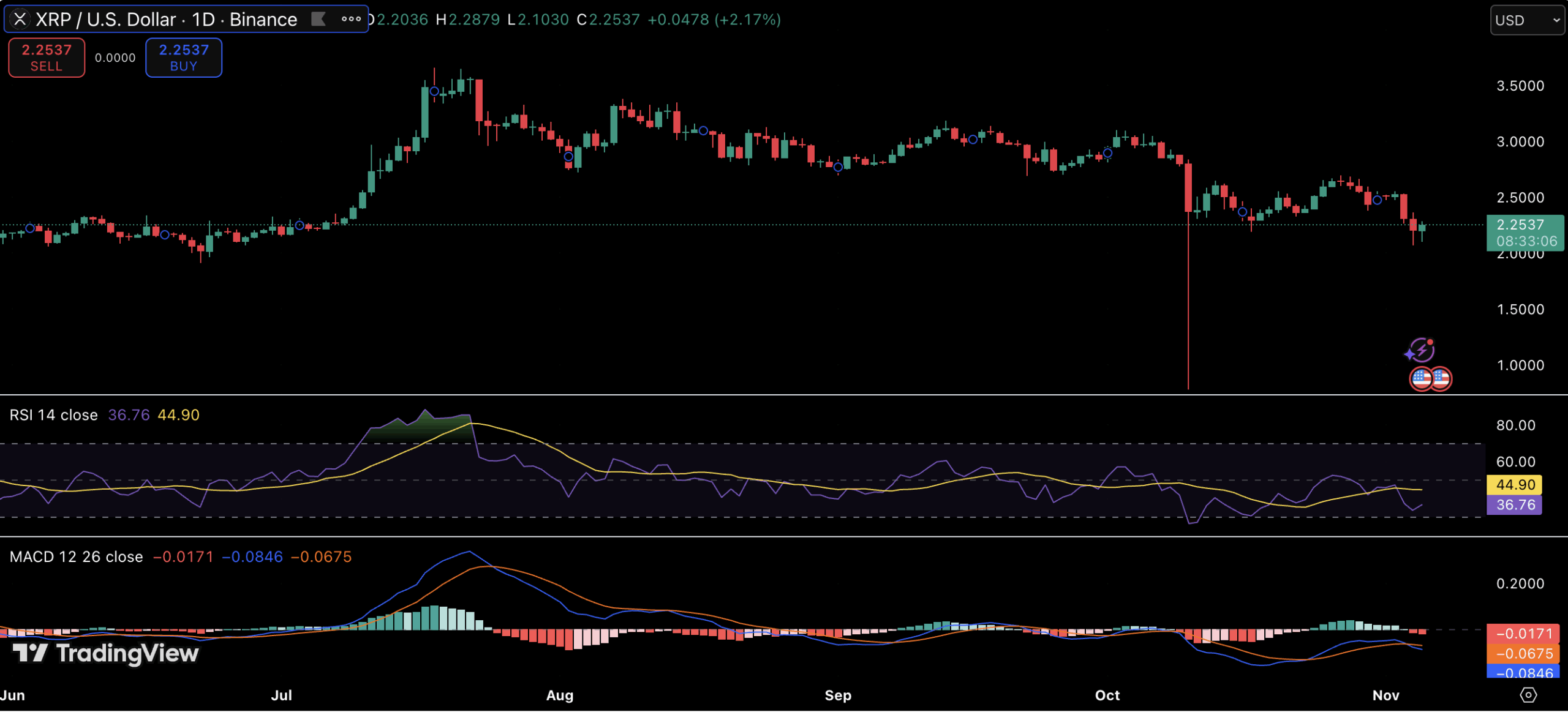 D’autres traders partagent la même inquiétude, évoquant la perte de la moyenne mobile exponentielle à 200 jours (EMA) et du niveau de retracement de Fibonacci 38,2 % à 2,47 $. L’histogramme du MACD est passé en territoire négatif, indiquant un affaiblissement du momentum, tandis que le RSI se situe autour de 36, signalant un état de survente mais aussi une faiblesse persistante.