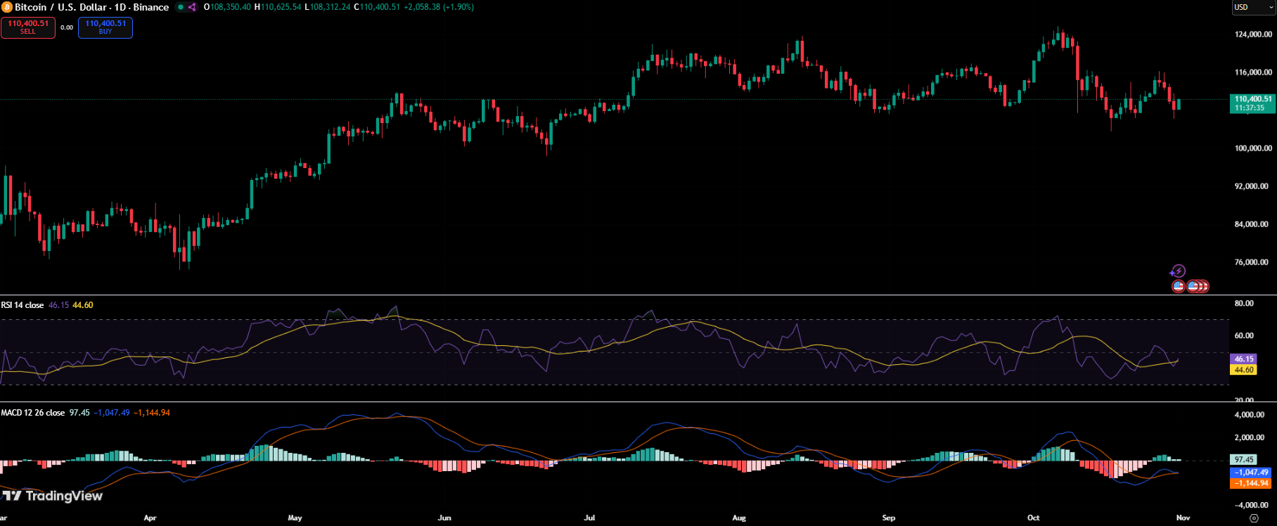 Selon les données de TradingView, le Bitcoin a clôturé la journée en hausse de près de 1,9 %, à 110.400,51 $. L’indice RSI se situe actuellement à 46, signalant une dynamique neutre – ni en surachat ni en survente. Ce niveau suggère un potentiel de hausse supplémentaire si la pression d’achat continue de se renforcer dans les prochaines sessions.