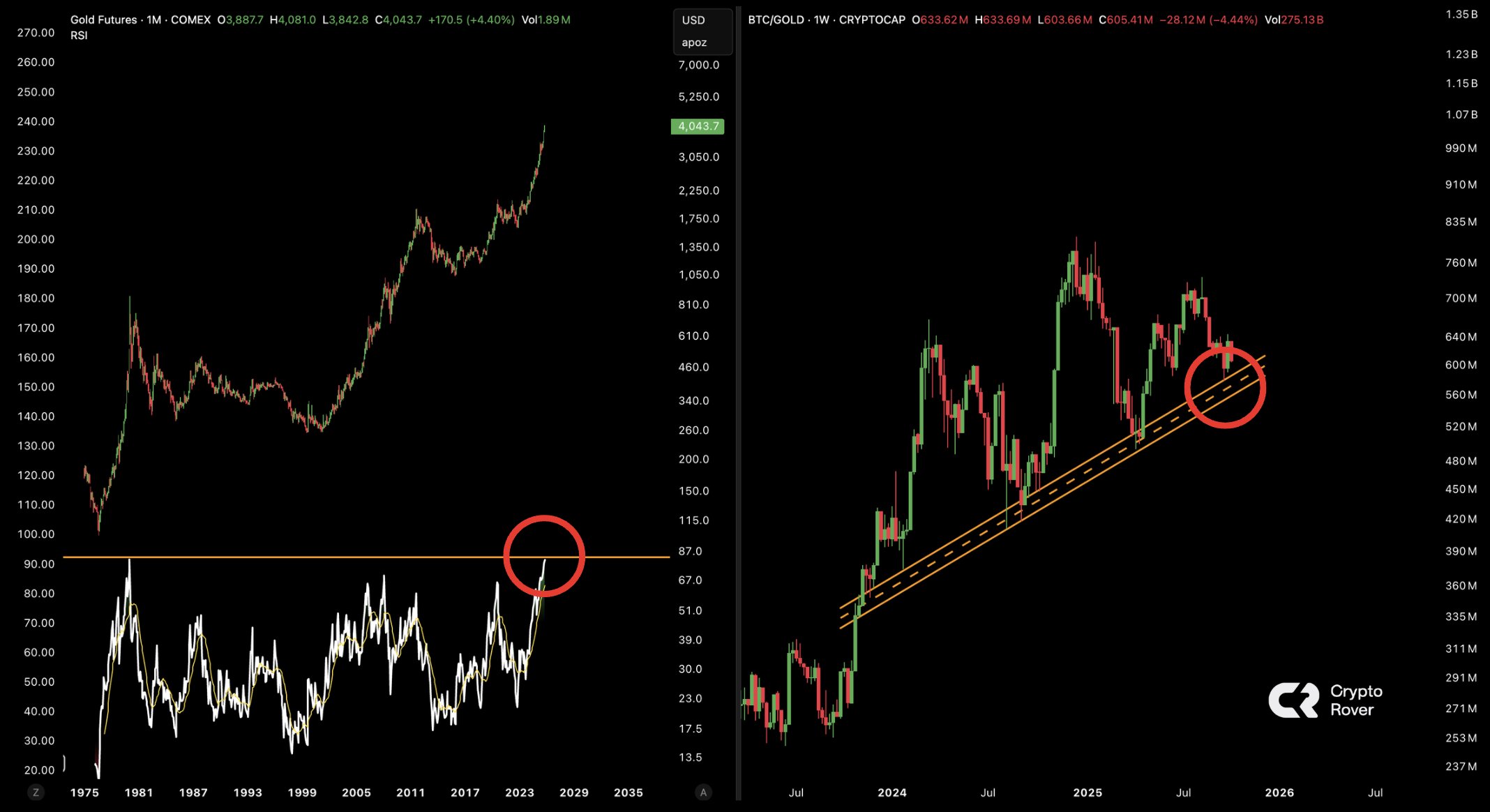 Un autre observateur du marché, Crypto Rover, a souligné un contraste marqué entre l’or et le Bitcoin. Son analyse montre que le RSI à long terme de l’or a atteint l’un de ses niveaux les plus surachetés depuis des décennies, tandis que le ratio BTC/or vient de toucher un support clé. Historiquement, de telles conditions ont marqué le début d’une surperformance du Bitcoin face à l’or.