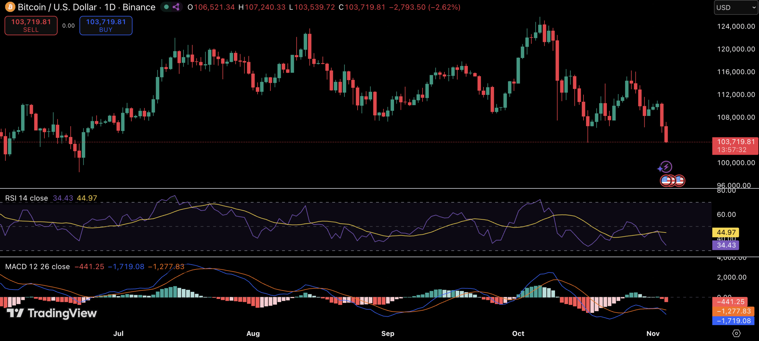 Mise à jour du prix du Bitcoin : BTC tombe sous les 104.000 $, 1,3 milliard $ liquidé, les signaux de vente passent au rouge