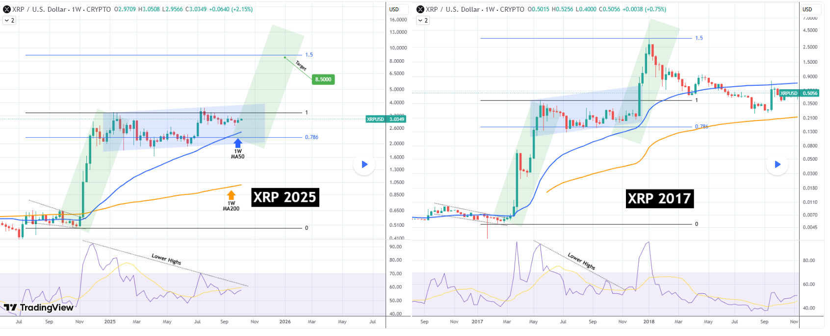 Selon la dernière publication de TradingShot sur TradingView, l’évolution actuelle du prix du XRP rappelle étrangement son comportement de fin 2017 juste avant que le jeton ne passe de 0,50 $ à 3,65 $, atteignant son record historique. L’analyste suggère que la même formation pourrait réapparaître sur le graphique hebdomadaire.