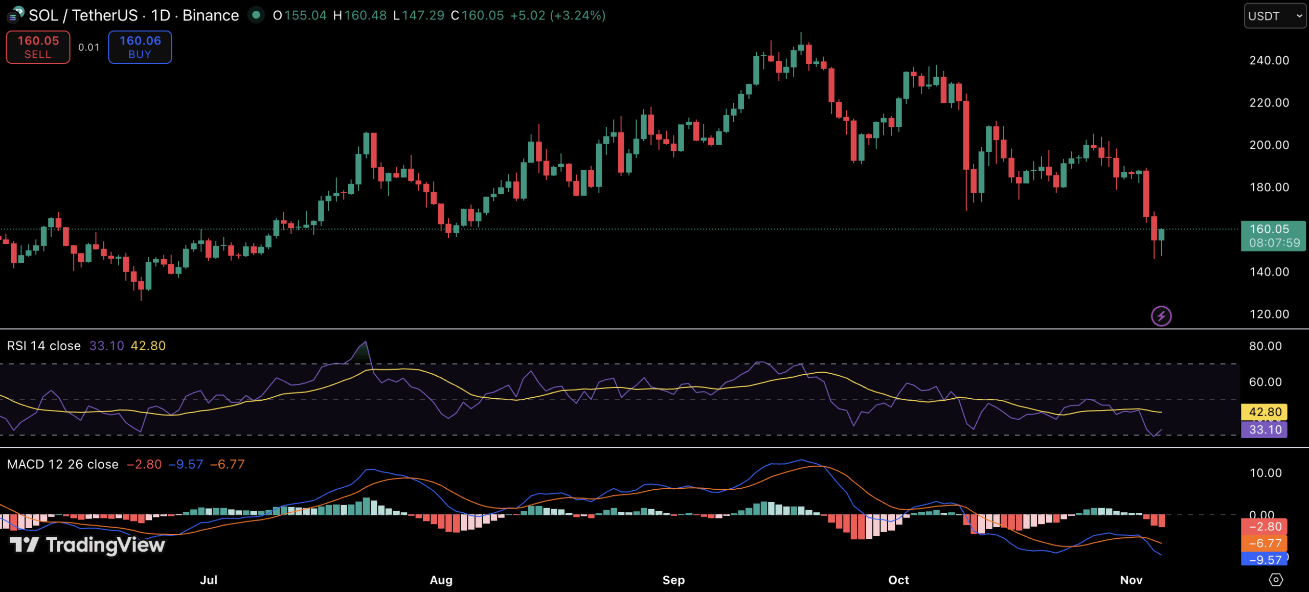 Après les récentes turbulences du marché, le jeton SOL montre les premiers signes de stabilisation. Après être tombé à 147 $, il s’est redressé à environ 160 $, soit une hausse d’environ 3 %.