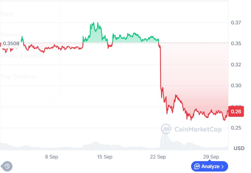 Trading in the $0.2600 area on September 30, according to CoinMarketCap, Pi Network is showing a significant 30% monthly decrease.