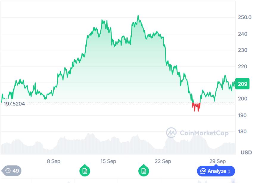 According to CoinMarketCap, Solana tested $213 on September 30 before settling in the $205-$206 range.
