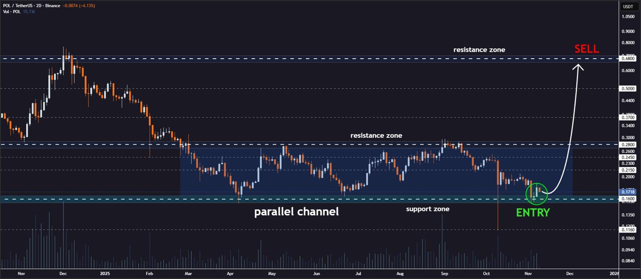 Polygon (POL) is showing signs of a technical reversal. Analyst JohncyCrypto identifies strong support near $0.16 within a two-day parallel channel. With the price resting near this lower boundary, a bounce appears likely. Resistance points at $0.28, $0.37, $0.50, and $0.68 provide clear targets for traders.
