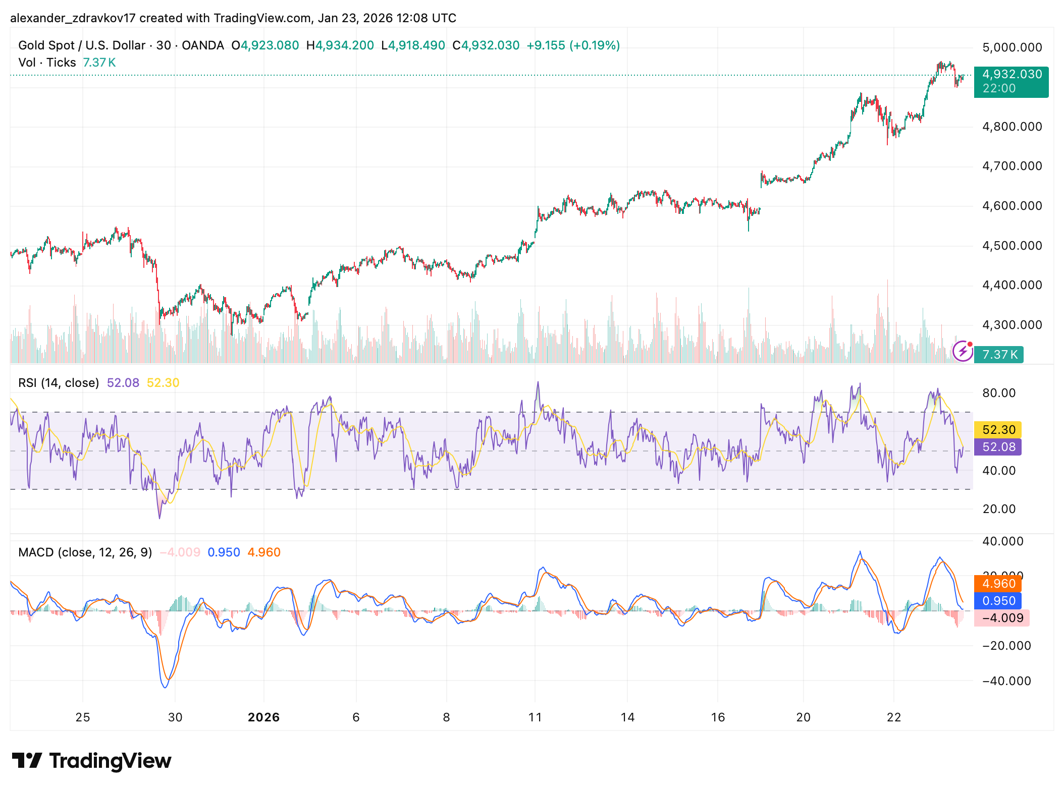 - Gold hit a new record high near $4,923, just 1.5% below $5,000