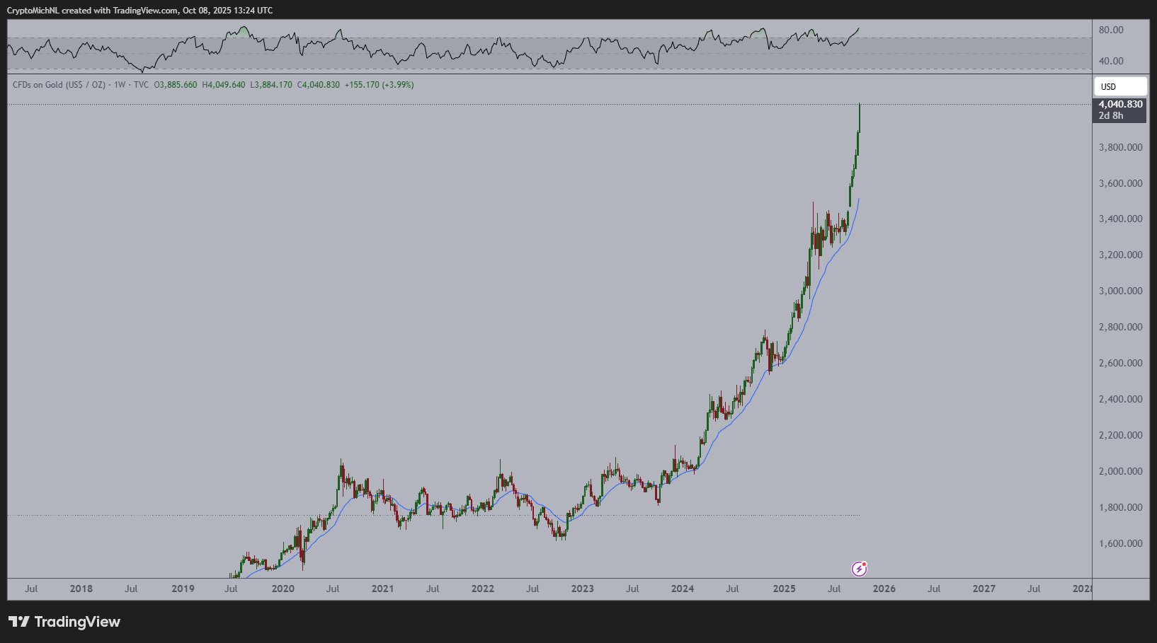 The TradingView chart shared by van de Poppe shows gold accelerating parabolically throughout the year, with prices climbing steeply past previous resistance levels. The move has astonished market observers who describe it as the most significant appreciation in the history of the commodity.