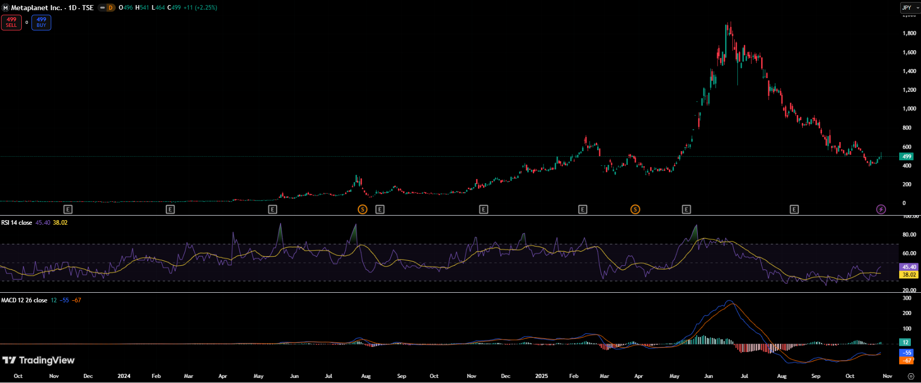 Le azioni Metaplanet sono salite a 519 JPY martedì prima di una leggera presa di profitto, con scambi intraday tra 464 e 541 JPY. Il volume di scambio ha superato i 75 milioni di azioni, ben al di sopra della media di 49 milioni. Questo aumento di attività sottolinea la fiducia rinnovata del mercato nel modello di business basato su Bitcoin.