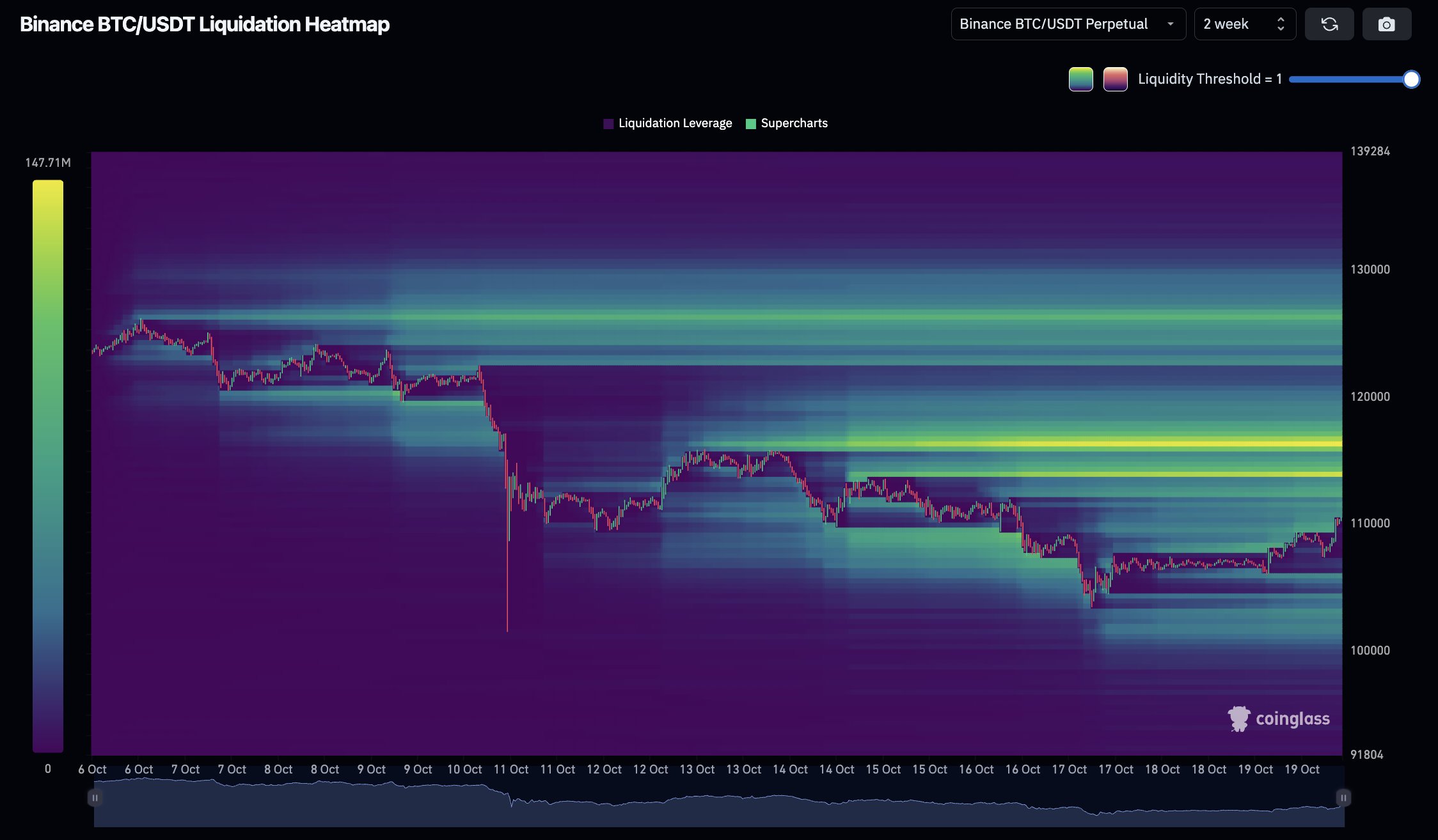 I dati di Coinglass rivelano ampi cluster di liquidità tra 111.000 e 120.000 $, indicando il potenziale per uno short squeeze. Secondo l’analista Crypto Rover, “uno short squeeze di Bitcoin sembra possibile”, poiché le heatmap delle liquidazioni mostrano posizioni corte altamente levaggiate appena sopra i livelli attuali.