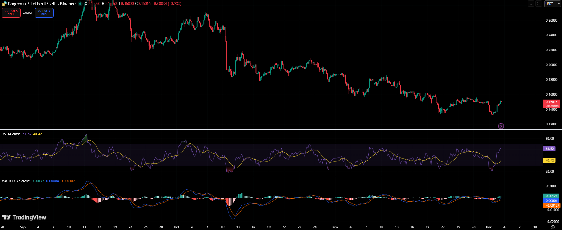 Il movimento arriva dopo un forte rimbalzo di 24 ore, alimentato da un rinnovato entusiasmo per gli ETF e da segnali tecnici più solidi nei grafici. I dati più recenti su quattro ore mostrano che DOGE sta cercando di stabilire un supporto a breve termine, mentre indicatori come RSI e MACD stanno invertendo la rotta dai minimi recenti.