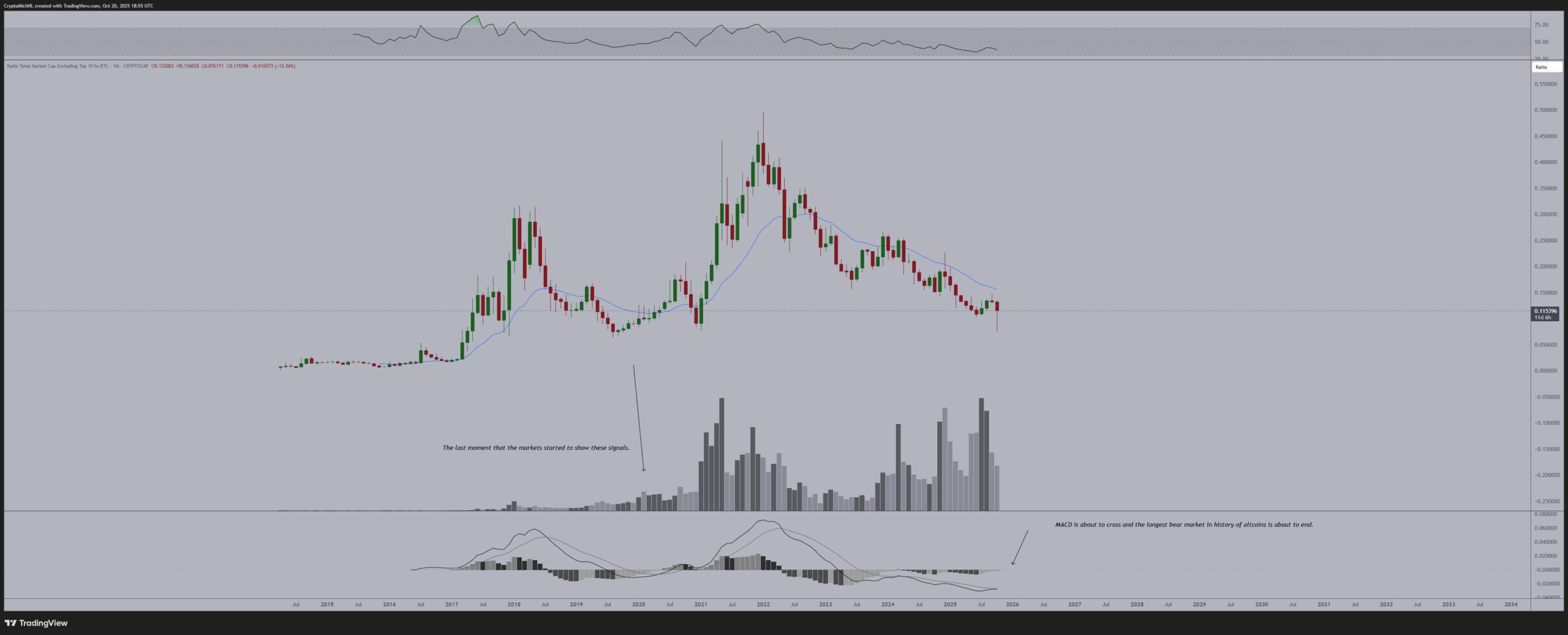 Van de Poppe ha evidenziato quello che definisce «il miglior grafico dei mercati in questo momento» – il rapporto tra la capitalizzazione totale del mercato degli altcoin e quella di Bitcoin. Il grafico, che include l’indicatore MACD (Moving Average Convergence Divergence), mostra un modello quasi identico alla configurazione pre-rialzista del ciclo precedente.