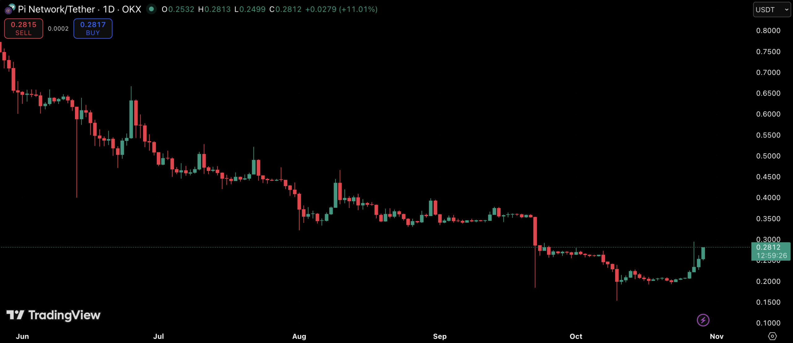 Dopo il rimbalzo dall’area di 0,19 $ della scorsa settimana, Pi Coin ha continuato a salire costantemente, superando 0,28 $ nella sessione di oggi – il suo livello più alto dall’inizio di settembre. Il movimento rappresenta un guadagno dell’11 % nelle ultime 24 ore e segnala un rinnovato ottimismo tra i trader.