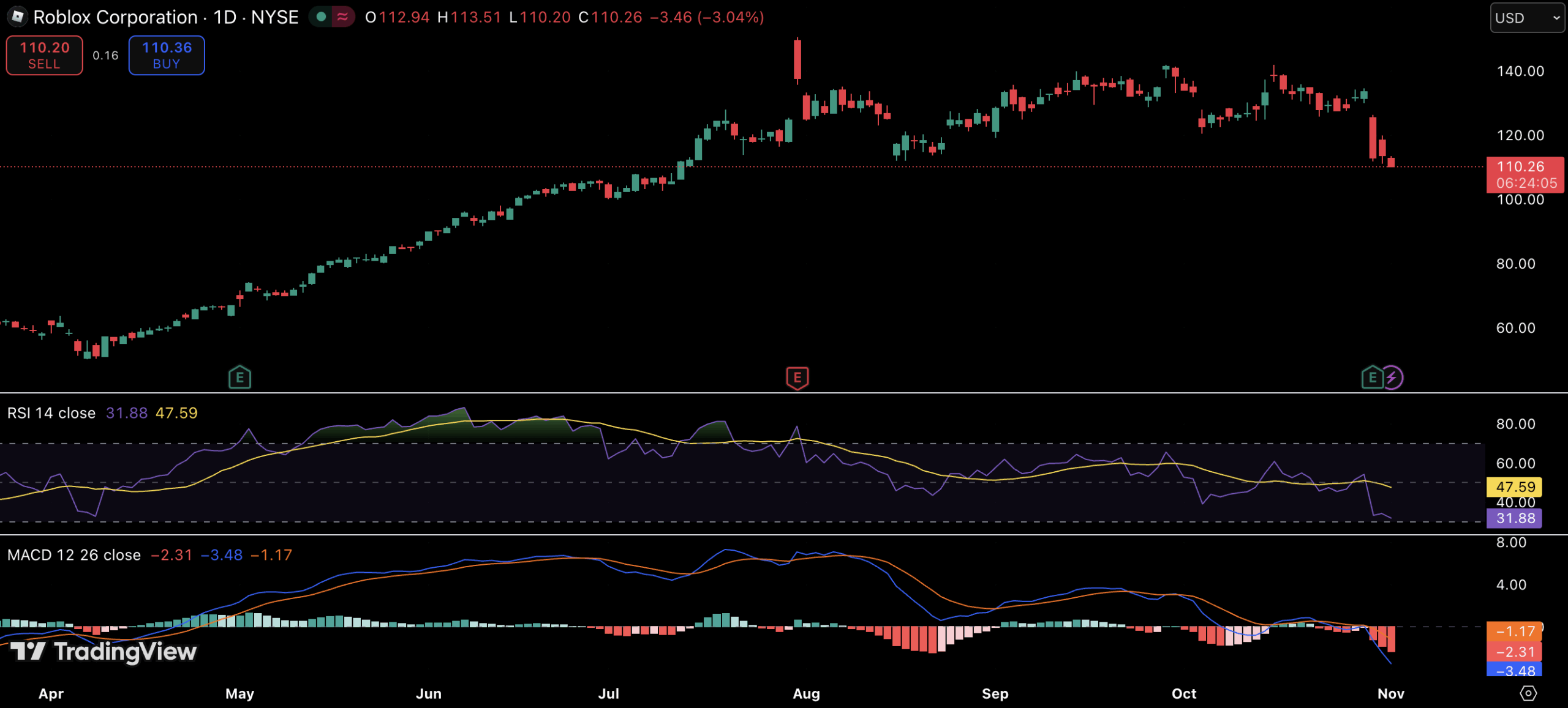 Tecnicamente, Roku sembra entrare in una fase iniziale di breakout, con indicatori di momentum positivi. Nel frattempo, l’RSI di Roblox è vicino alla zona di ipervenduto e il MACD resta negativo, suggerendo una possibile fase di consolidamento.
