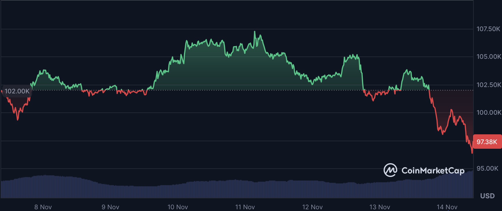 昨日 100K ドル割れが発生すると、売りが加速し、調整はより明確な下降トレンドへと変化した。記事執筆時点では BTC は 97,300 ドル付近で推移しており、市場は安定を試みているが、買い圧力は弱い。