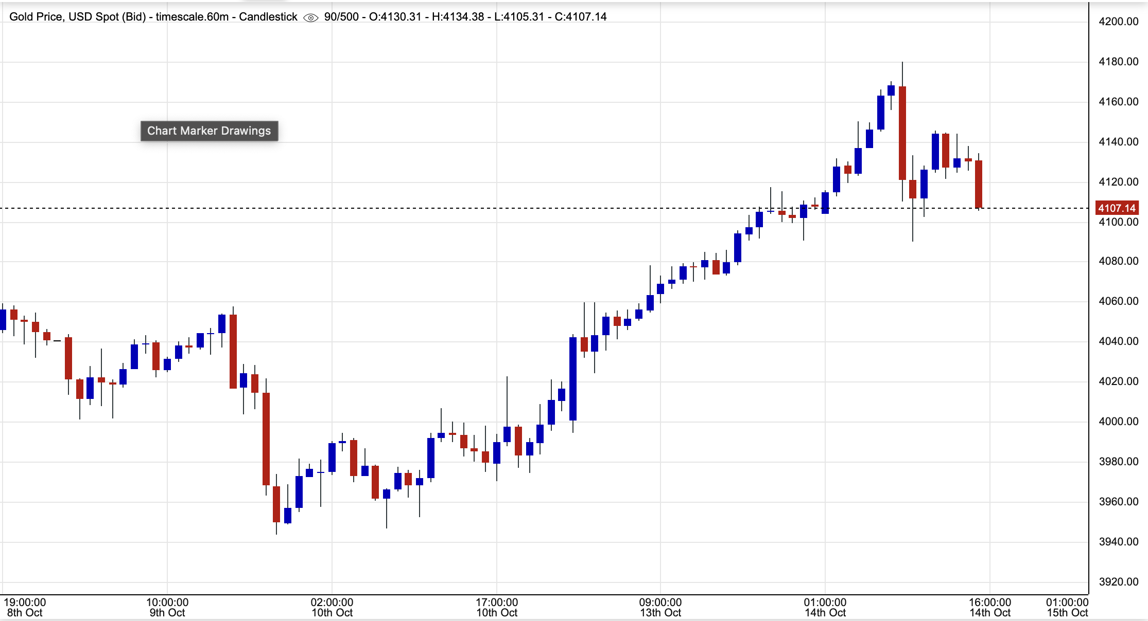 時間足の金チャートを見ると、4,180ドルを超えてピークを付けた後、スポット価格は冷却を始め、現在は約4,107ドル付近で推移している。最近の上昇は金を記録的な水準に押し上げたが、モメンタム指標が警告を発しているため、トレーダーはますます慎重になっている。
