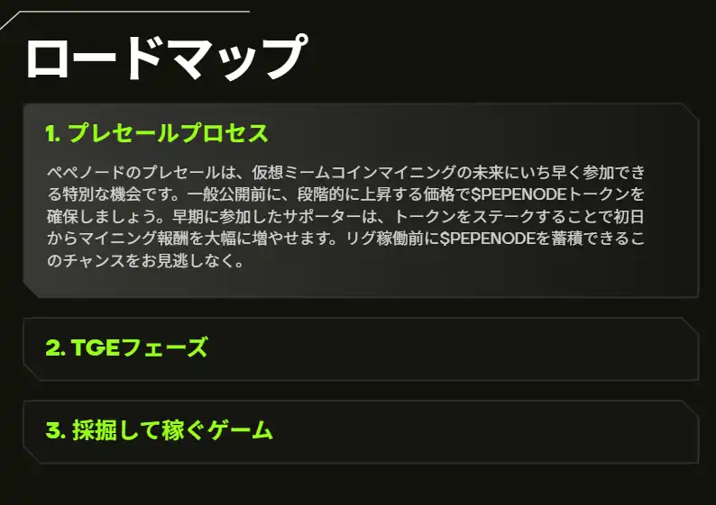 このようにPEPENODEは、マイニングとステーキングの実用性に加え、ミームコインの話題性も兼ね備えた新機軸のプロジェクトとなっています。