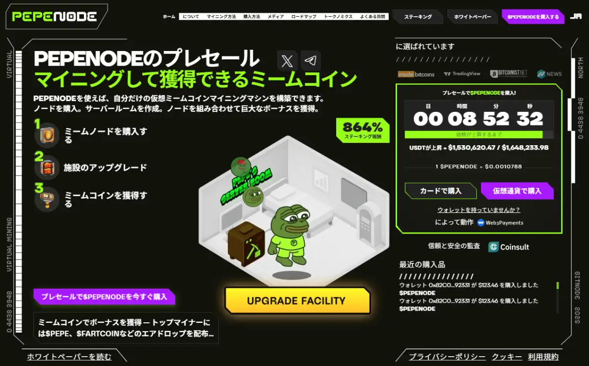 また、独自のミームコイン「PEPENODEトークン」は現在プレセール中。低価格の段階からトークンを保有できる他、希望すればステーキングによる追加報酬を得られるなど、参加すればプレセールならではのメリットを享受できます。